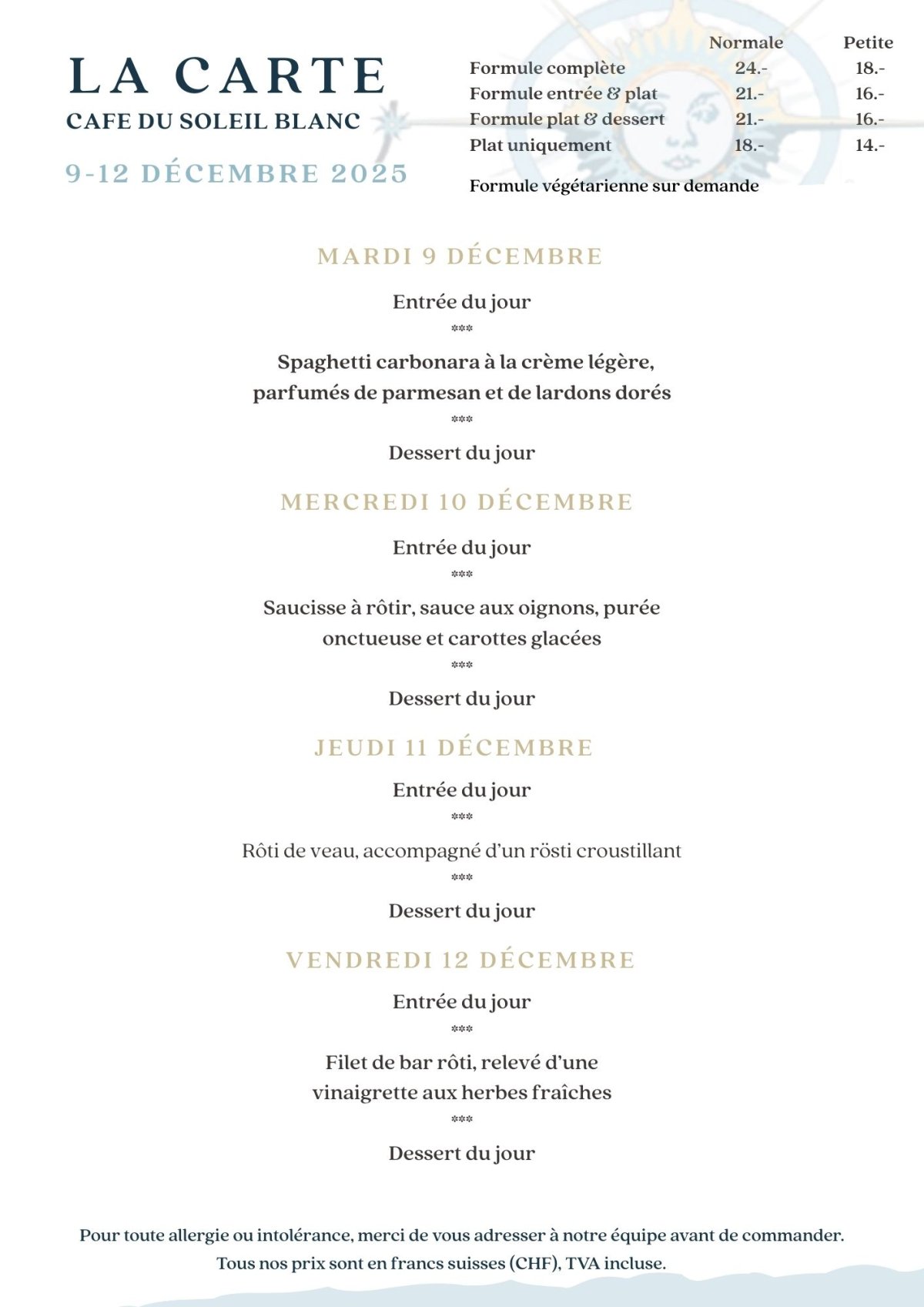 Uniquement le menu du jour est proposé sur le service de midi ainsi que les fondues